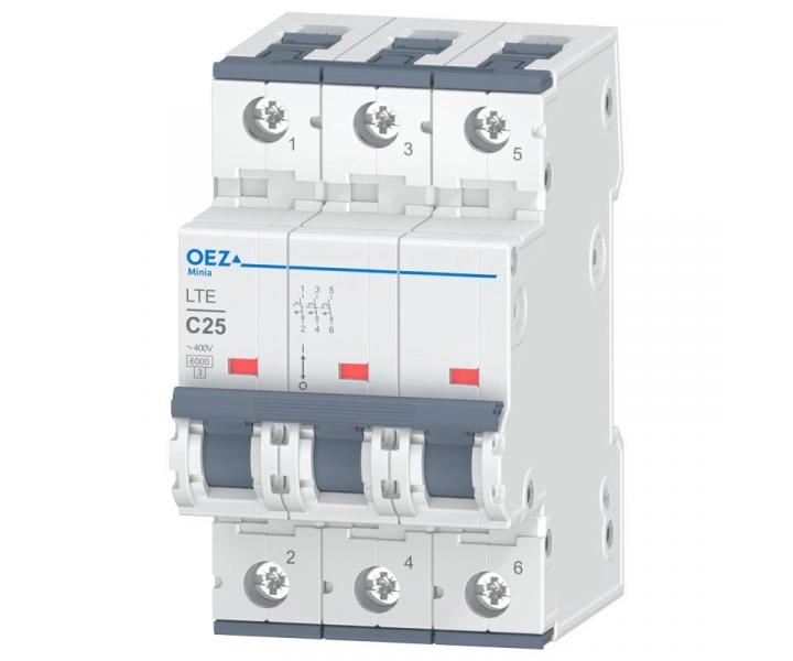 Jistič OEZ LTE-25C-3 - In 25 A, Ue AC 230/400 V / DC 216 V, charakteristika C, 3pól, Icn 6 kA
